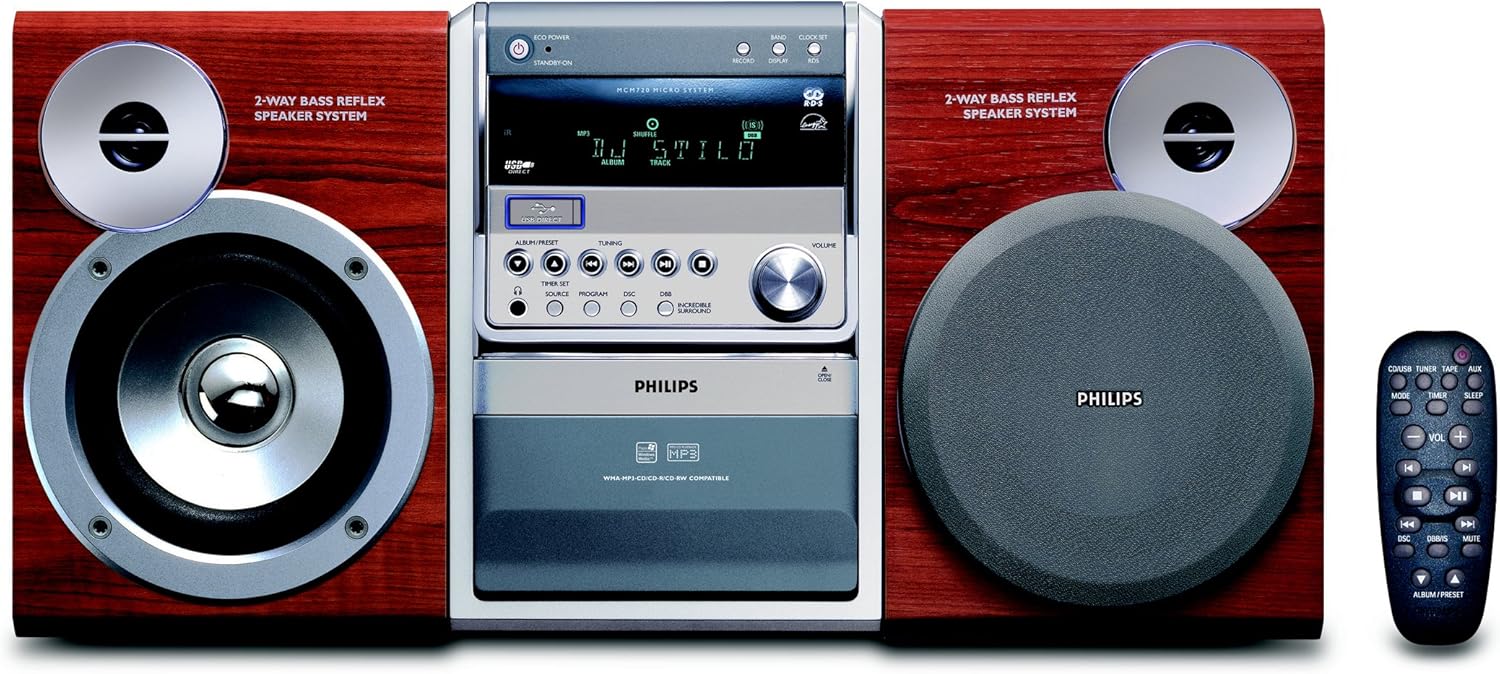 Figure 2: Detail of a Philips MCM 720 speaker. This close-up highlights the 2-way bass reflex speaker system, featuring a tweeter at the top and a larger woofer below, set within a silver-colored ring on a rich wood-grain cabinet.