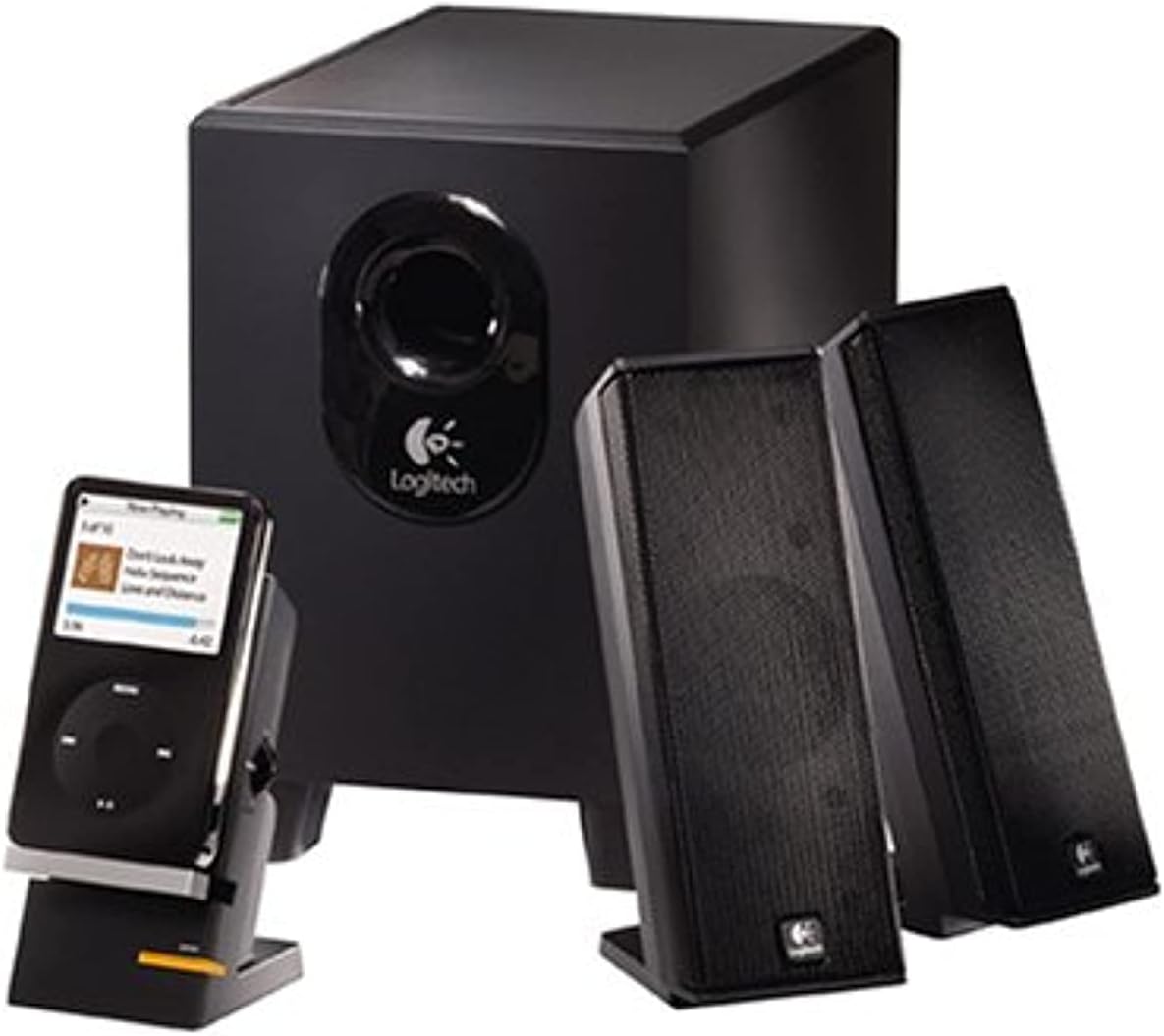 1-сүрөт: The Logitech X-240 2.1 Speaker System, showcasing the subwoofer, two satellite speakers, and the control center with a portable media player docked.