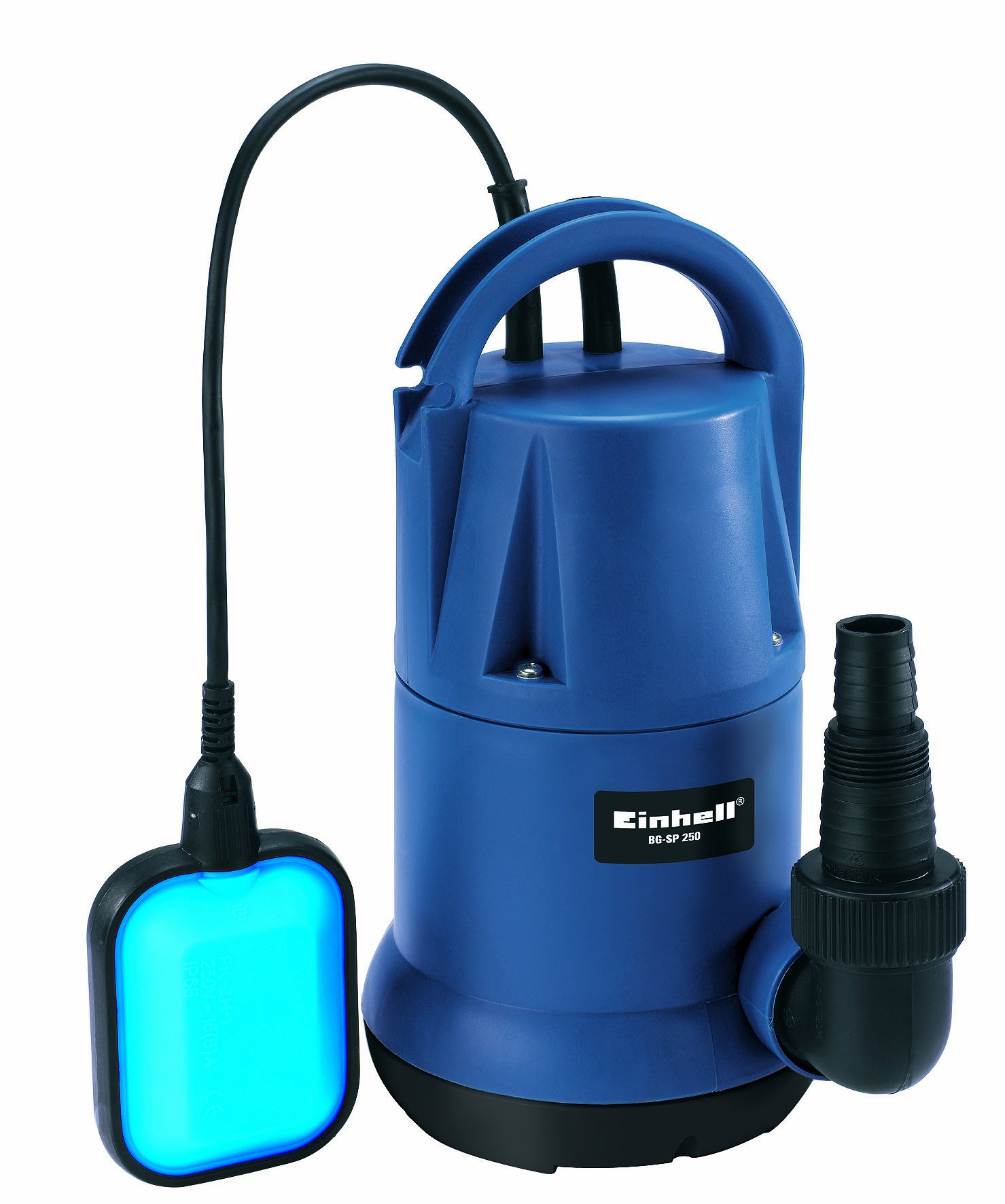 1-сүрөт: The Einhell BG-SP 250 submersible pump, illustrating the main body and the discharge outlet where a hose would be connected. This image shows the robust construction and the general appearance of the pump, ready for hose attachment.