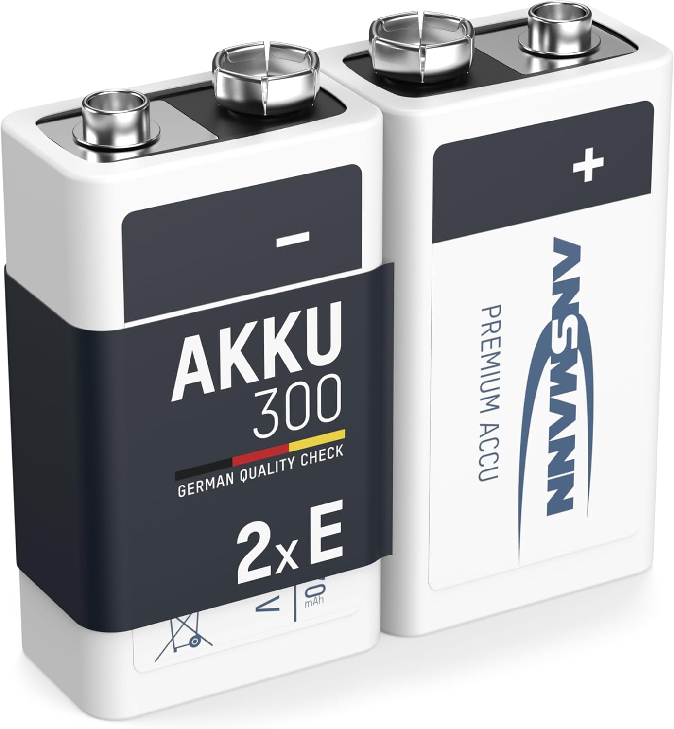 This image displays two ANSMANN 9V 300mAh NiMH rechargeable batteries, highlighting their design and key branding.