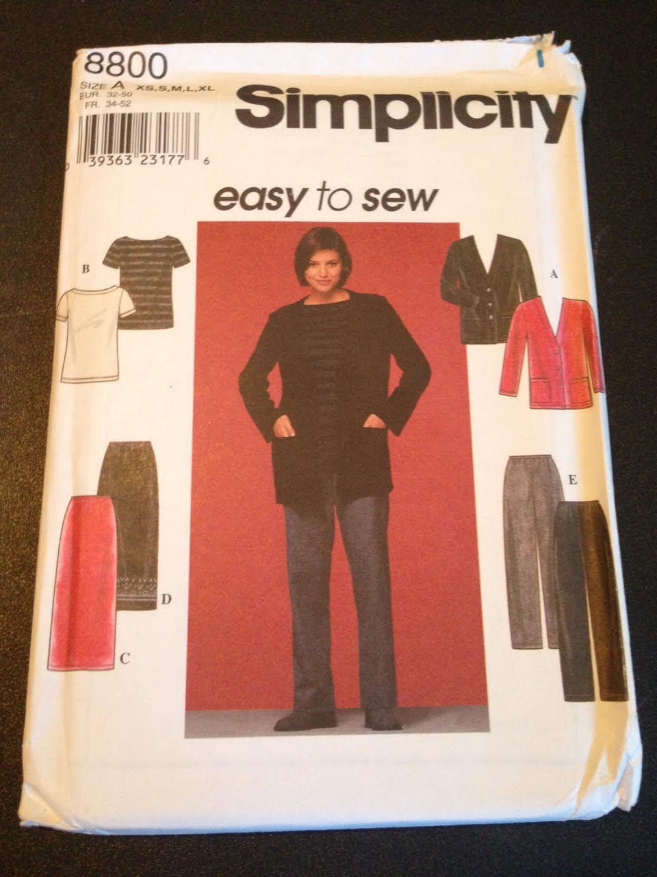The Simplicity 8800 pattern is available in Size A (XS, S, M, L, XL). Always compare your body measurements to the sizing chart provided on the pattern envelope to select the most appropriate size. It is often recommended to make a muslin (test garment) to check fit before cutting into your final fabric.