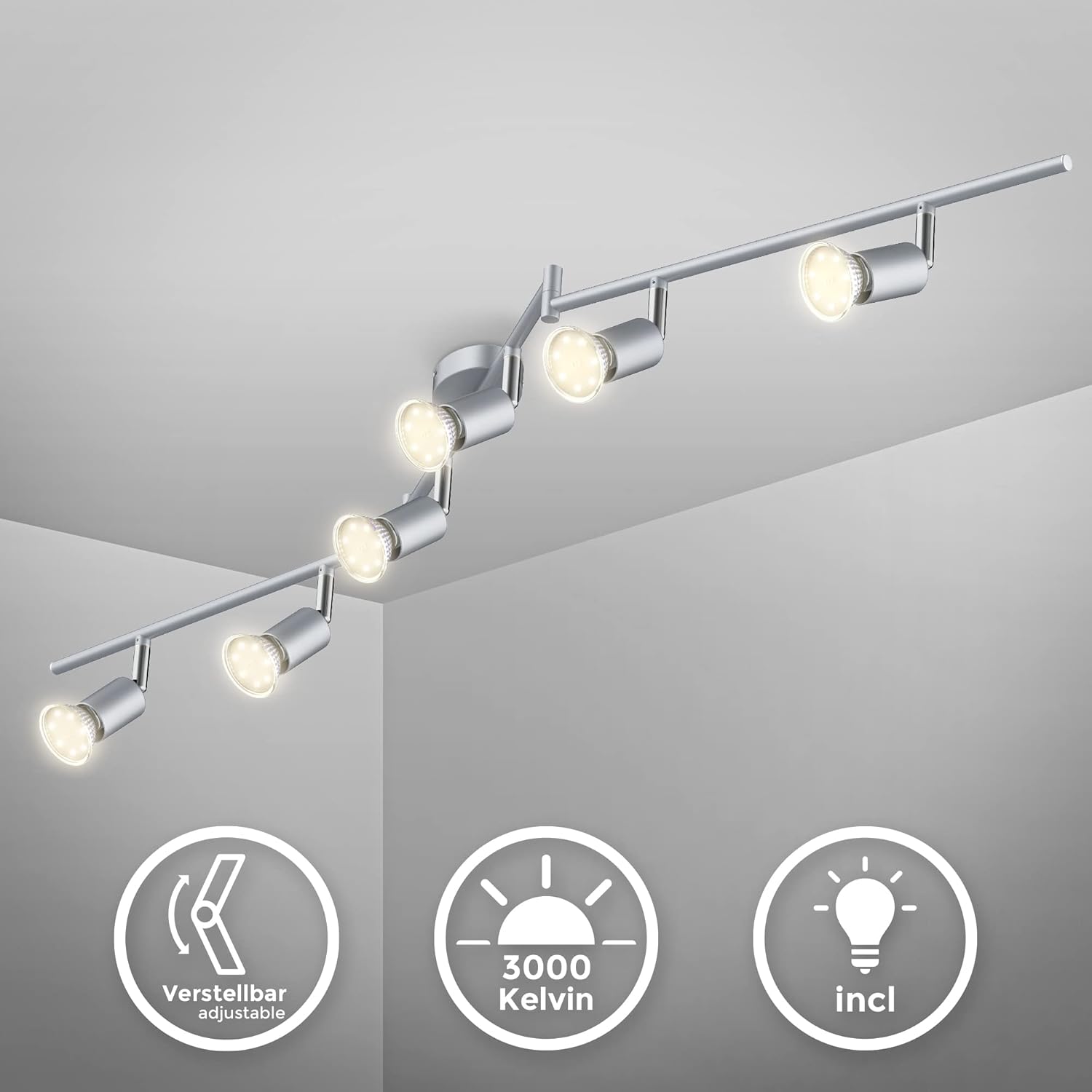 This manual provides detailed instructions for the safe installation, operation, and maintenance of your B.K.Licht 6-Spot LED Ceiling Light, Model 30-01-06-T. Please read these instructions carefully before use and retain them for future reference. This ceiling light features six adjustable spots with GU10 LED bulbs, providing warm white light at 3000K.