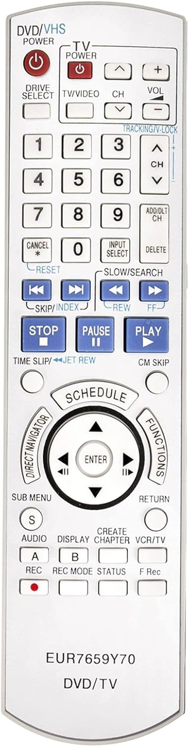The VINABTY EUR7659Y70 is a replacement remote control specifically engineered to function with a range of Panasonic DVD and VCR recorder units. It replicates the functionality of the original remote, allowing you to control your device's playback, recording, and menu navigation features.
