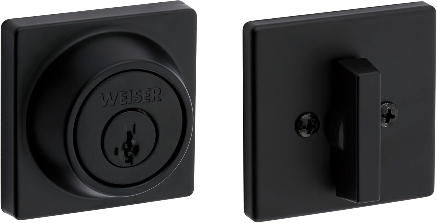 The Weiser Elements Square Single Cylinder Deadbolt is designed for use on exterior doors where key and security are required. This deadbolt can be locked or unlocked by a key on the outside or by the thumbturn on the inside. It features SmartKey re-key technology, allowing you to re-key the lock quickly and easily. This product is ANSI/BHMA Grade 3 certified, includes an adjustable latch for standard door preparations, and has a 1-inch deadbolt throw. Its universal door handling fits both right and left-handed doors, and it is ADA Compliant. It fits door thicknesses from 1 3/8" to 1 3/4" and comes in a Matte Black finish.