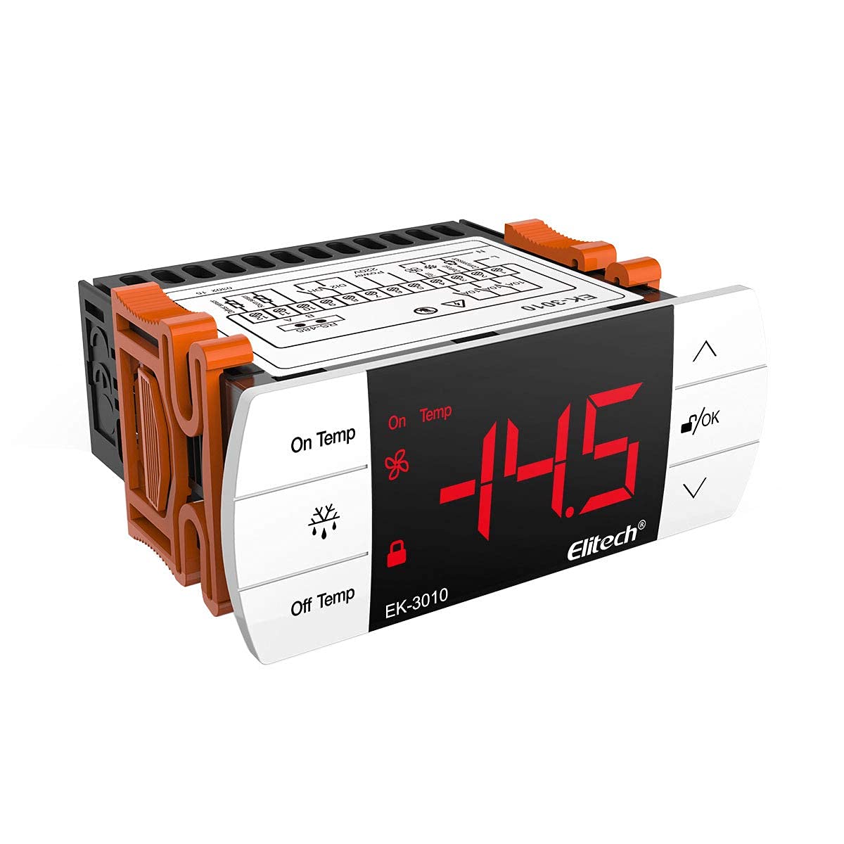 The Elitech EK-3010 is a digital temperature controller designed for managing temperature in various applications, including cold storage or heating equipment. It provides temperature measurement, display, and control functionalities. Key features include temperature calibration, over-temperature alarms, sensor failure alarms, and a one-key recovery for factory default settings. The device incorporates a touch key design with a key lock function for secure operation. It features a single sensor input for cabinet temperature and a single control output for refrigeration or heating equipment.