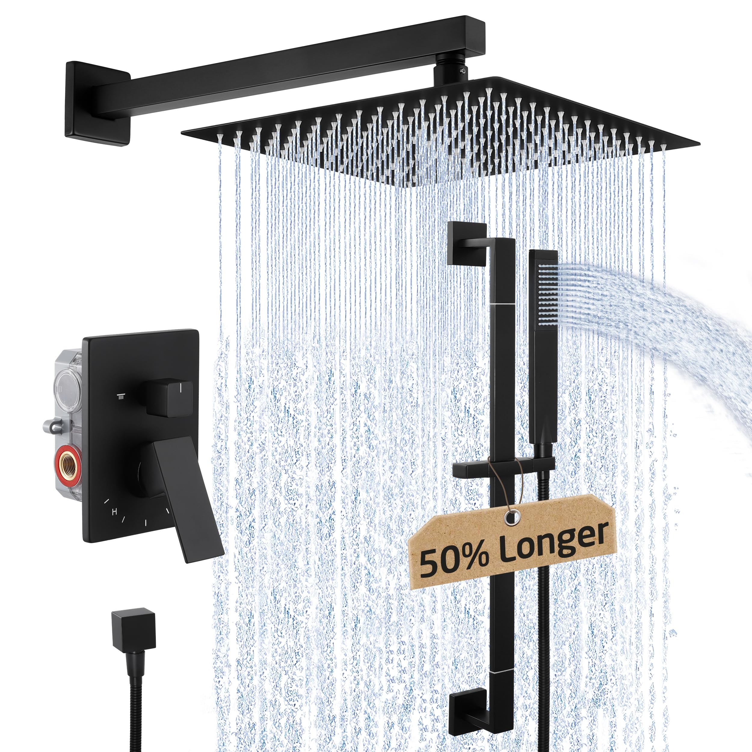 Once the rough-in valve is installed and tested, proceed with installing the faceplate, handle, shower arm, rain shower head, slide bar, and handheld shower components. Ensure all connections are tight and leak-free. The 12-inch rain shower head is made of SUS304 stainless steel.