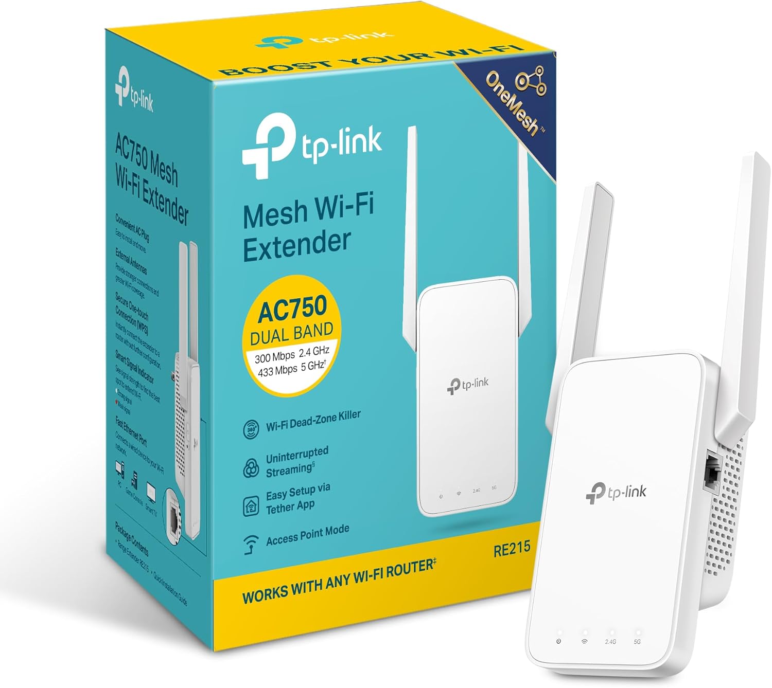 The RE215 features a compact design with external antennas for enhanced signal coverage. It includes an Ethernet port, allowing it to function as a wireless adapter for wired devices or as an access point.