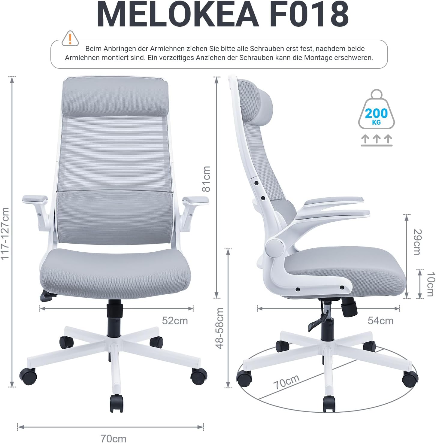 Image: MELOKEA F018 Office Chair with key dimensions (height 117-127cm, seat width 52cm, seat depth 54cm, armrest height 29cm, seat cushion thickness 10cm, base diameter 70cm) and an assembly note regarding armrest tightening. The chair supports up to 200 kg.