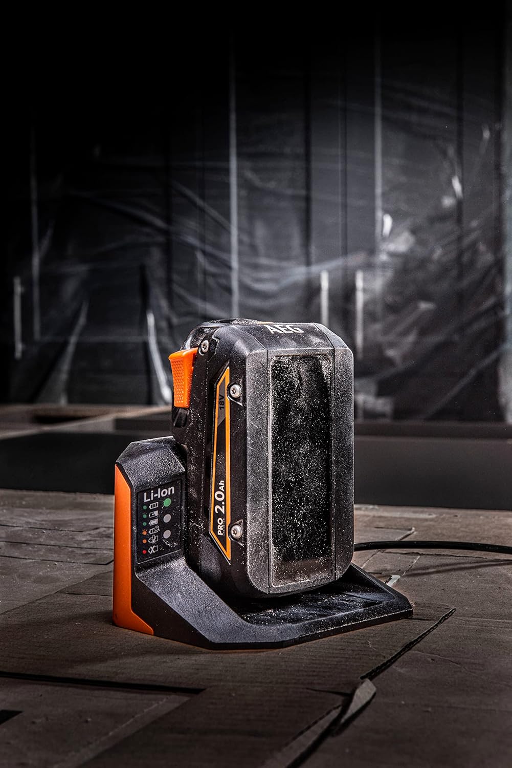 Сүрөт: AEG PRO18V 2.0Ah литий-иондук батарейка L1820S AEG батарейканын заряддоочу түзүлүшүндө кубатталып жатат. Заряддоочу түзүлүштө заряддоо абалын көрсөтүү үчүн индикатор жарыктары бар.