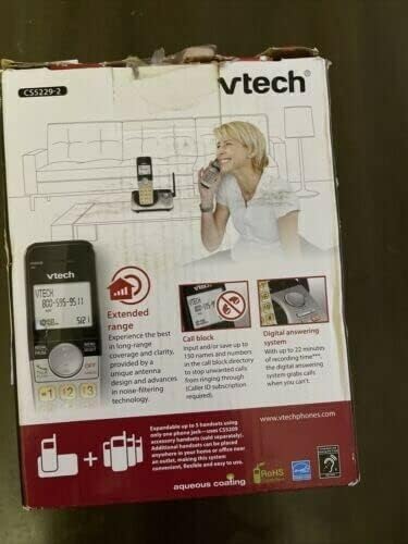 This image displays the product packaging for the vtech CS5209 DECT 6.0 Cordless Phone Expansion Handset. The box highlights key features including extended range for better coverage and clarity, a call block function capable of storing up to 150 numbers to prevent unwanted calls (requires Caller ID subscription), and a digital answering system with up to 17 minutes of recording time to capture messages when you are unavailable. The packaging also indicates that the system is expandable up to 5 handsets using only one phone jack.