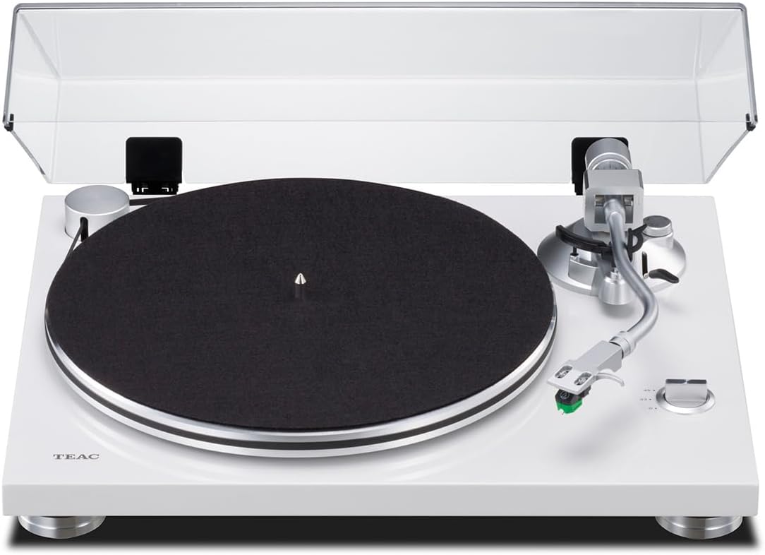 Сүрөт 1.1: Бүттүview TEAC TN-3B-SE кол менен башкарылуучу кур менен башкарылуучу айланма таблицанын ак түстө, анда тарелка, тонер рычагы жана чаң капкагы камтылган.
