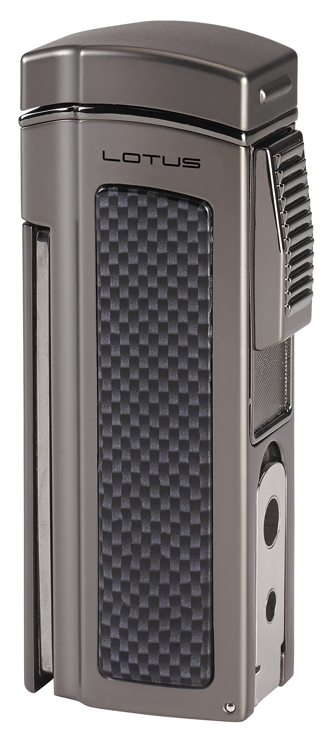 Image 1.1: The Lotus Dominator Table Cigar Lighter in Gunmetal & Carbon Fiber. This image displays the lighter's overall design, highlighting its sturdy construction and integrated tools.