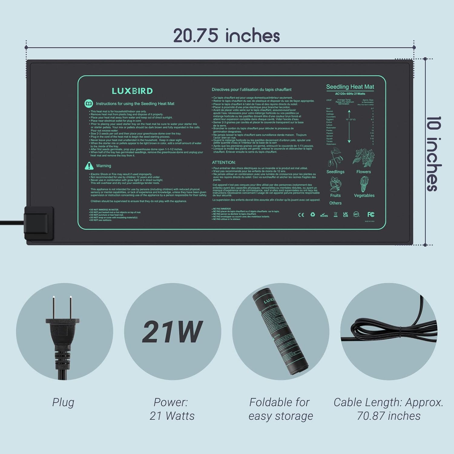 - Seedling Heating Mat: 10" x 20.75" size, 21W power consumption, designed to raise root temperatures 50℉-68℉ (10℃-20℃) above ambient.