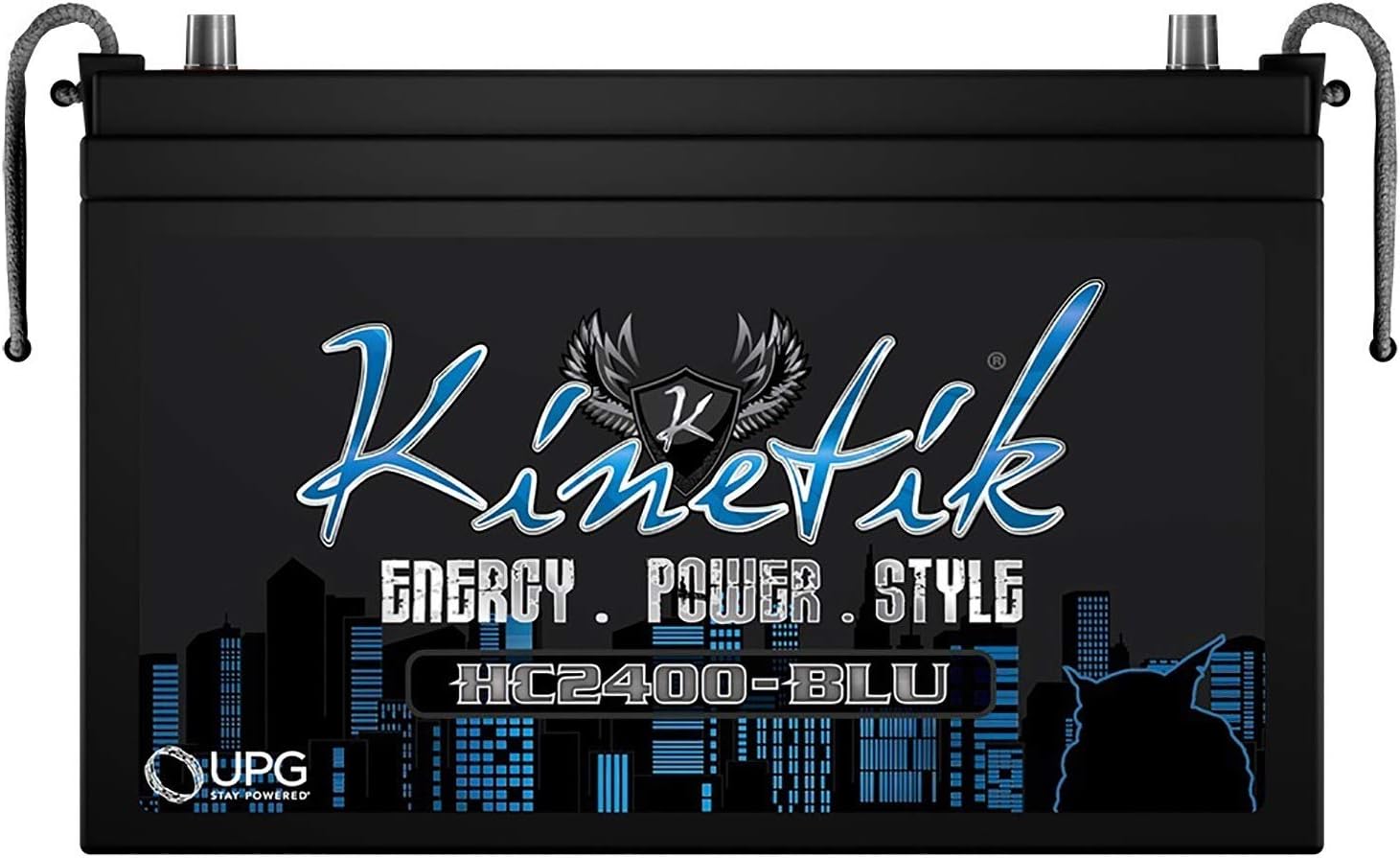Figure 1.1: Kinetik HC2400-BLU Power Cell, front view, showcasing the Kinetik logo and model number.
