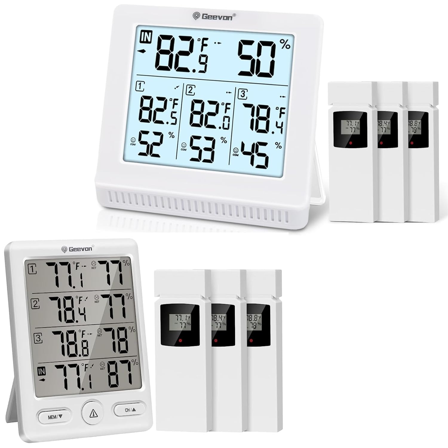 The Geevon Digital Indoor Outdoor Thermometer system consists of a main display unit and three wireless remote sensors. The main unit displays indoor temperature and humidity, along with readings from the three outdoor sensors.