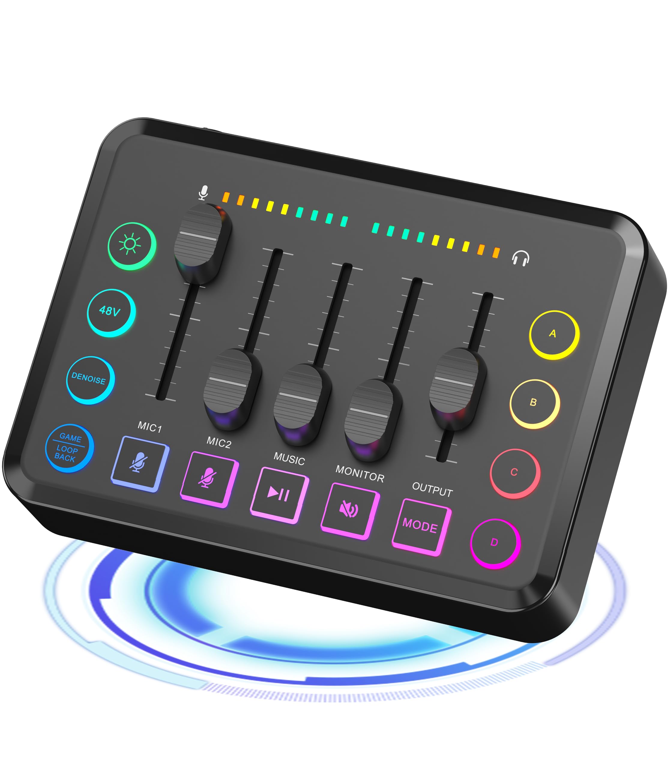 - Controllable Vibrant RGB Design: RGB button on the mixing panel for various live streaming themes. Vibrant, non-distracting lights with flowing RGB color rotation or a steady pace.