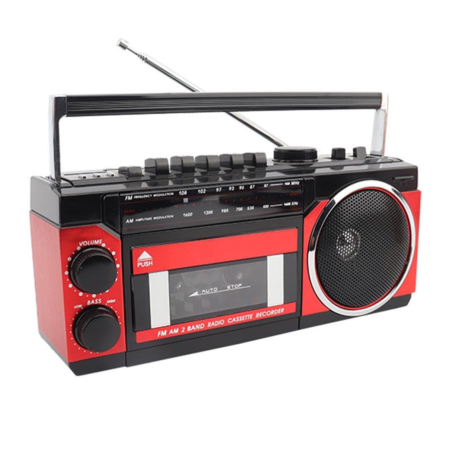 - FM radio with real cassette player functionality, including roll back and forth.