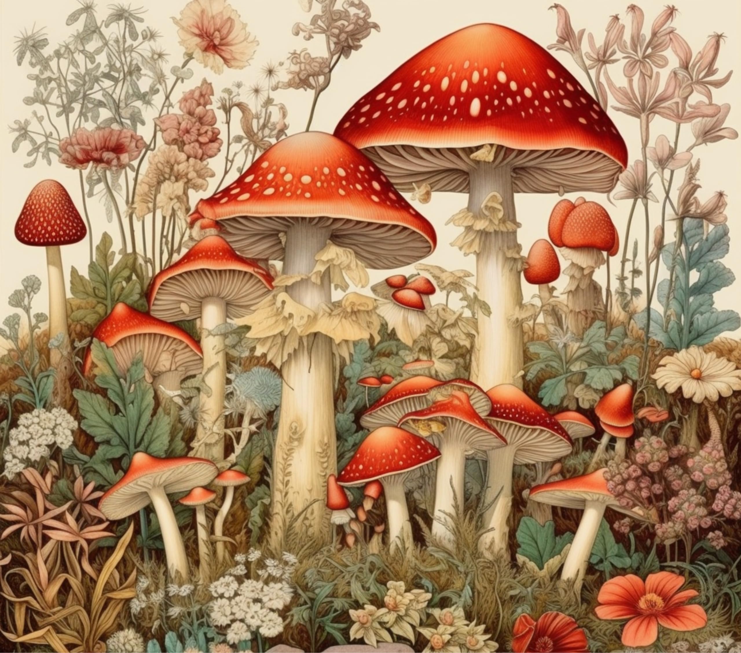 Image description: A square fabric panel featuring a detailed illustration of various red-capped mushrooms and botanical elements on a light background, surrounded by a white border.