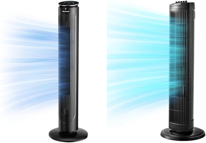 This image displays the 30-inch PELONIS tower fan, showing its compact design and the blue streams of air indicating its cooling capability. It is a portable model suitable for various rooms.