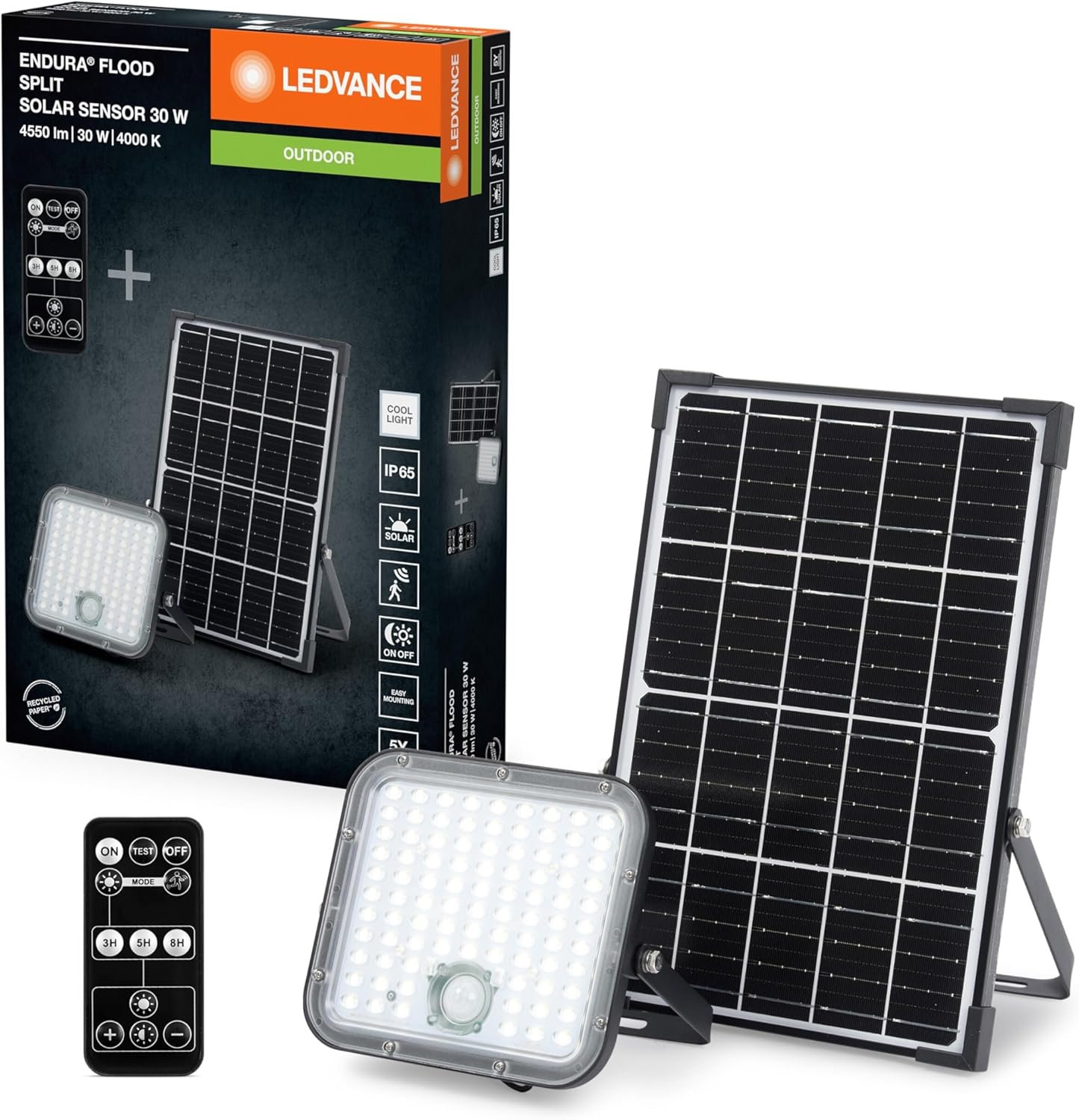 Thank you for choosing the LEDVANCE Endura Flood Split Solar Sensor LED Outdoor Light. This product is designed to provide efficient and flexible outdoor illumination using solar power. It features a separate floodlight and solar panel, a PIR motion sensor, a daylight sensor, and a remote control for convenient operation. Please read this manual carefully before installation and use to ensure proper function and safety.