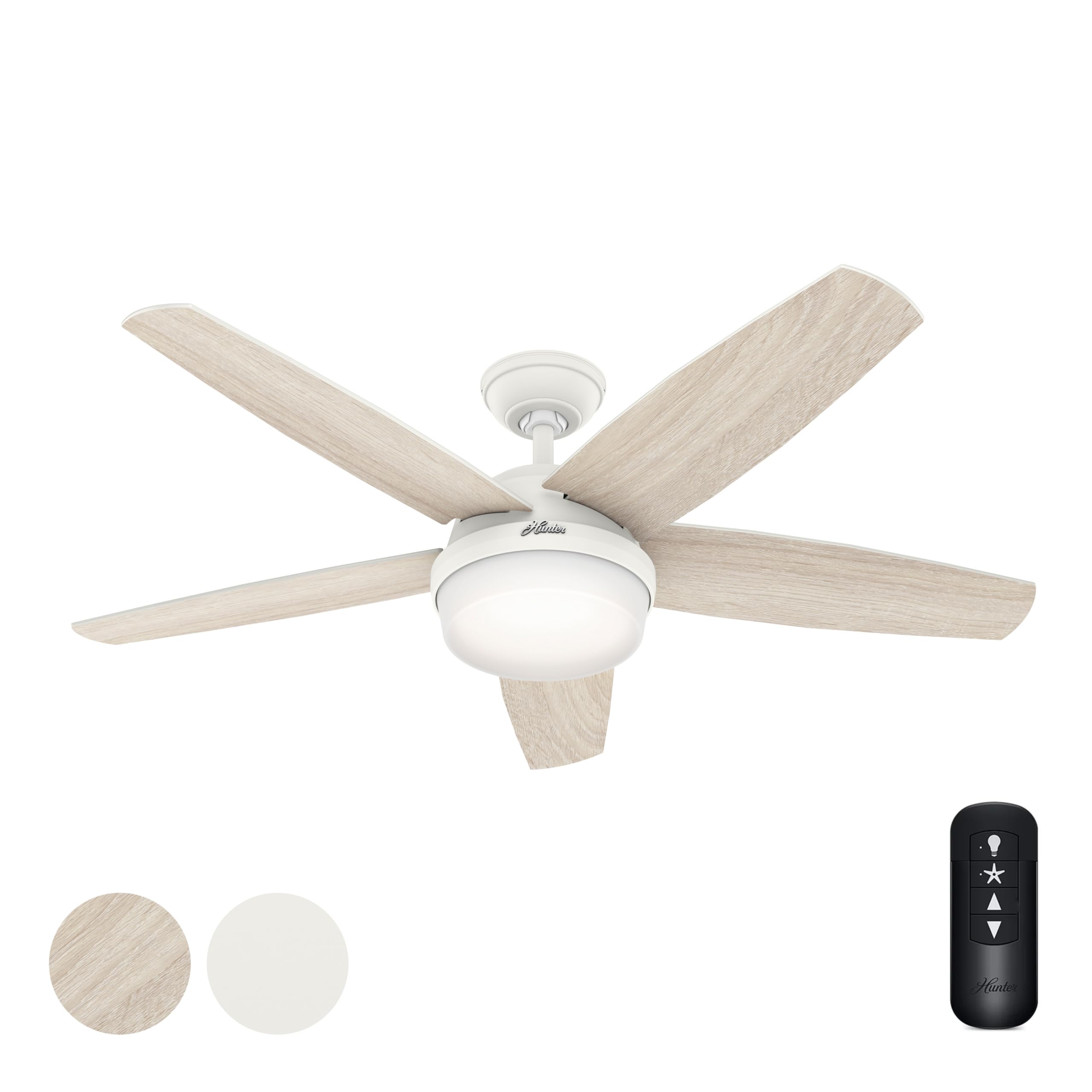 Thank you for choosing the Hunter 52-inch White Indoor Ceiling Fan. This fan is designed to provide optimal air circulation and lighting for medium to large rooms, including bedrooms, dens, dining rooms, kitchens, and offices. Featuring energy-efficient, dimmable LED bulbs and reversible blades, this fan offers both functionality and modern design. The included handheld remote control ensures convenient operation of fan speeds and lighting.