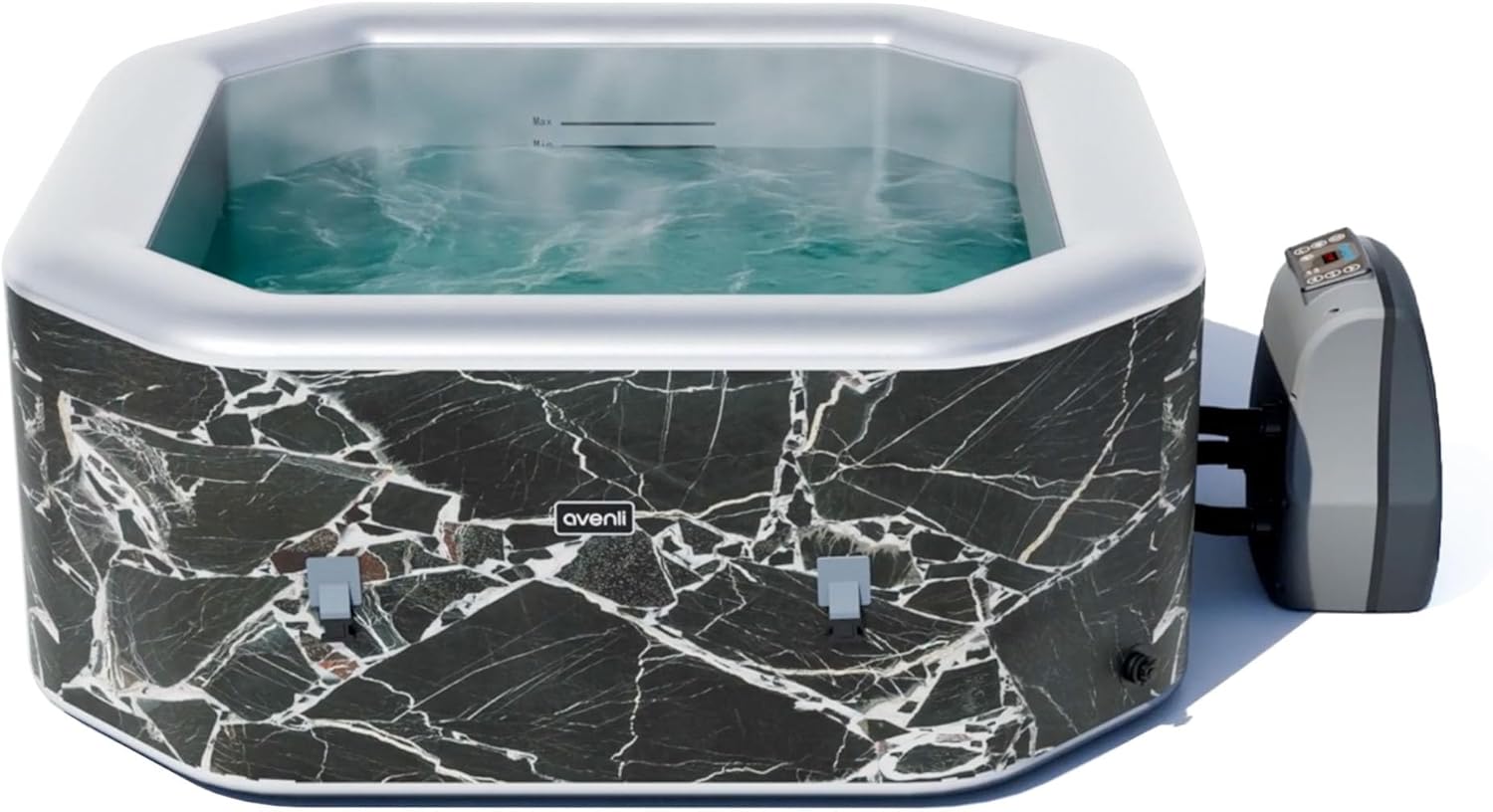 Image: The AVENLI Inflatable Hot Tub Spa, showcasing its black marble design and external pump unit.