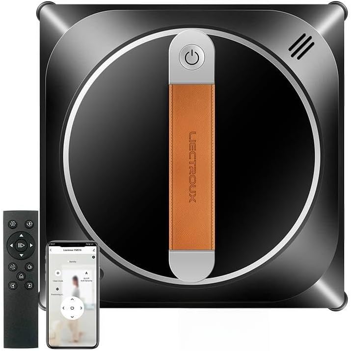 Image: The LIECTROUX YW910 Window Cleaning Robot, shown with its remote control and a smartphone displaying the control app. The robot is black with a central orange handle.