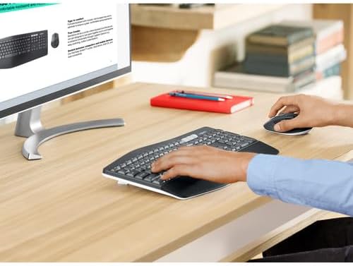 Image: A user's hands are positioned on the Logitech MK850 keyboard and mouse, demonstrating comfortable use at a wooden desk with a monitor.