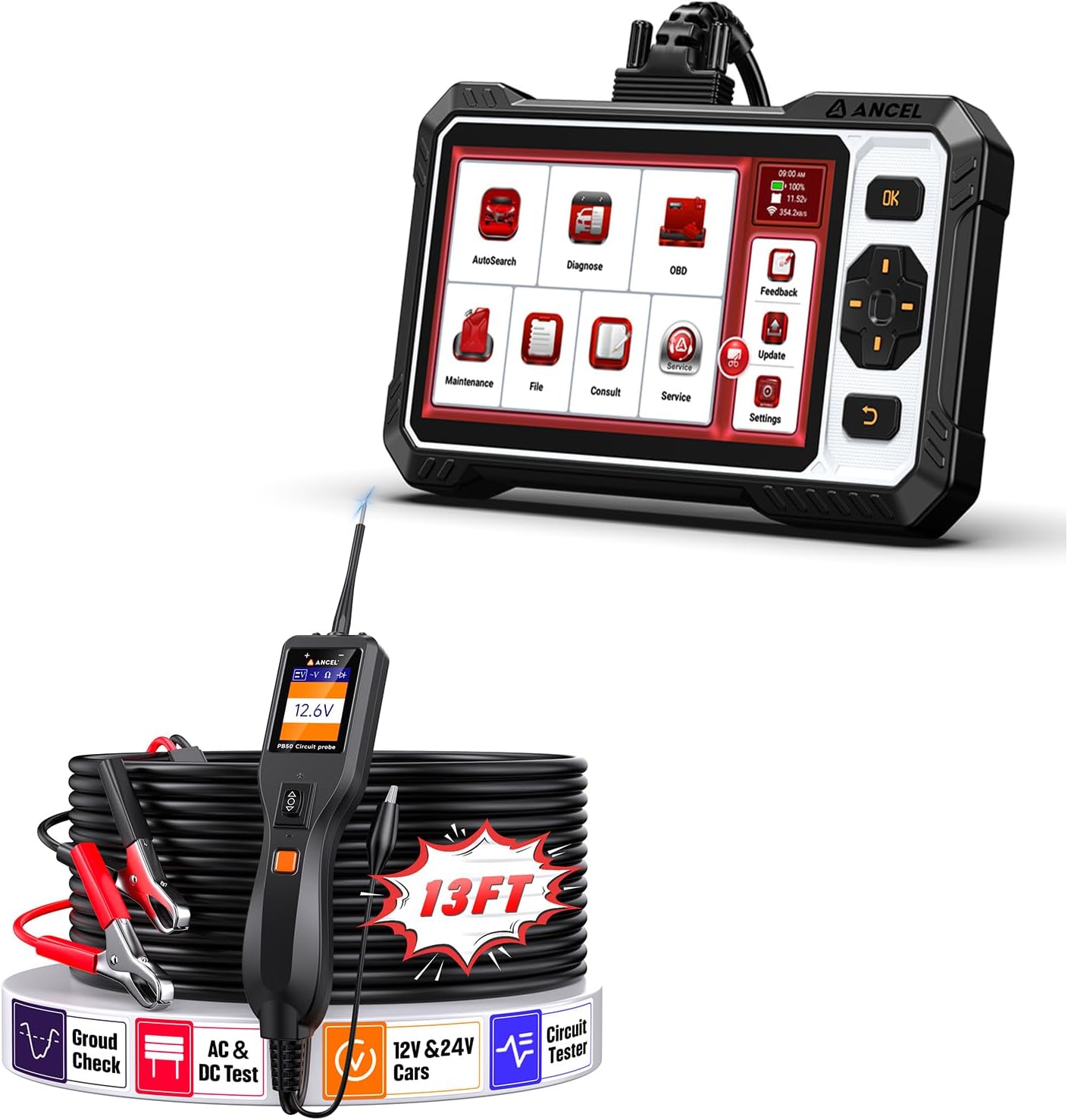Image: The ANCEL FX6100 Bidirectional Scan Tool and the ANCEL AL-PB50 Automotive Circuit Tester, shown together with their accessories.