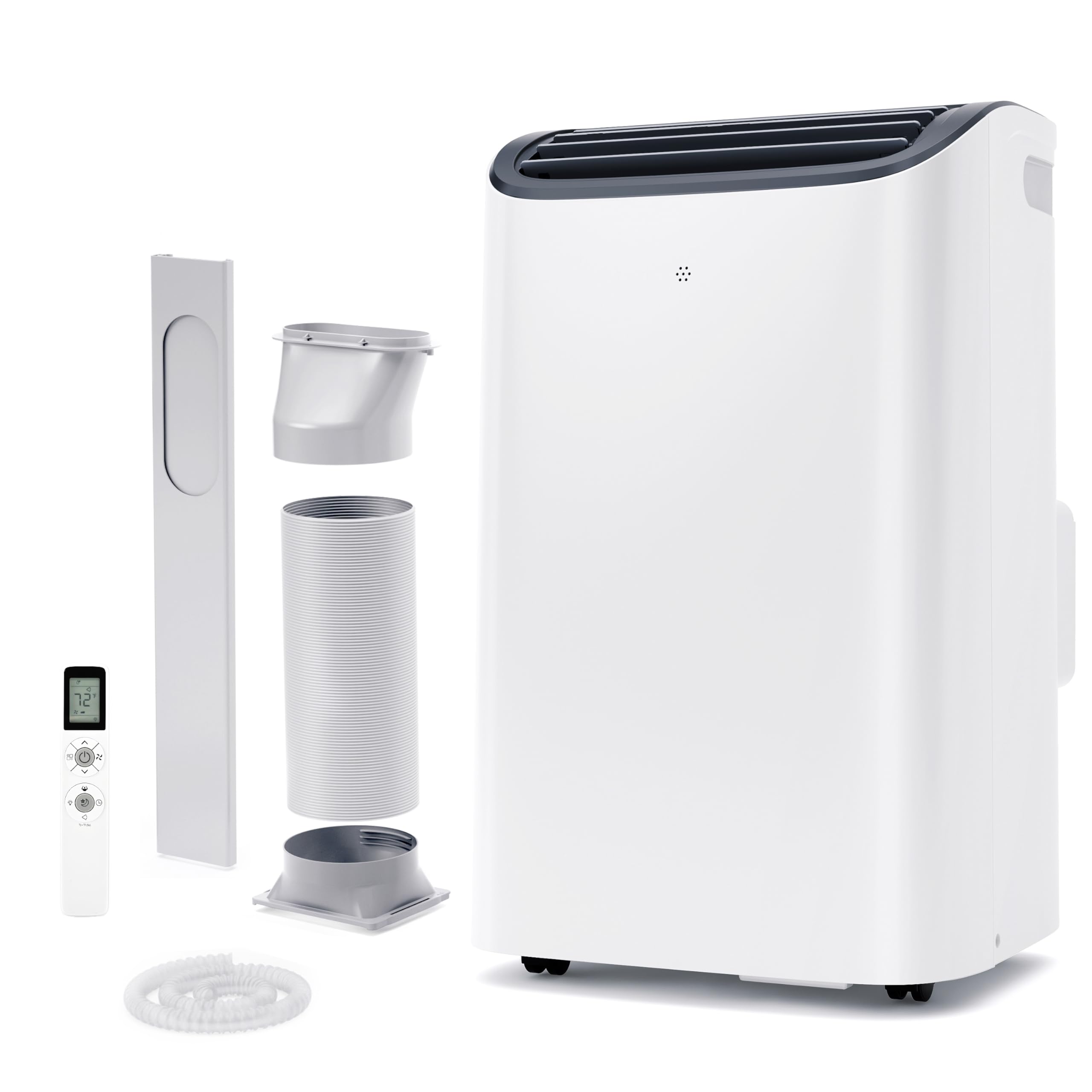Image 1.1: The EUHOMY Portable Air Conditioner with its exhaust hose and window kit components. This image illustrates the overall appearance of the unit and the accessories required for proper setup, including the flexible exhaust hose and the adjustable window sealing plate.