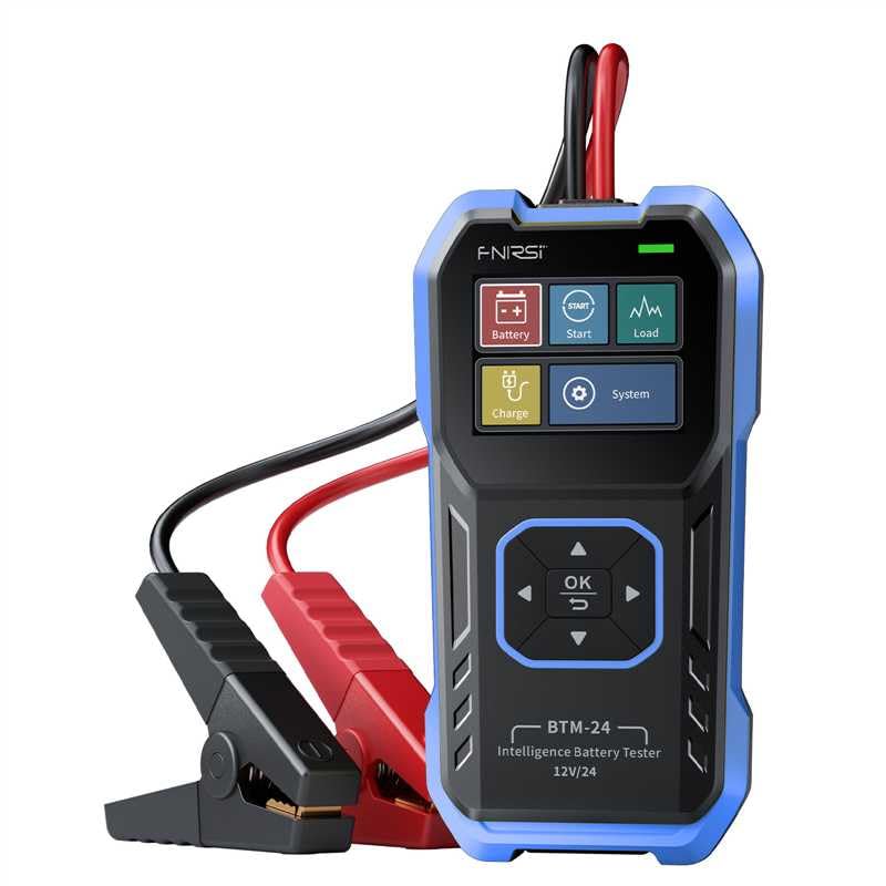 Сүрөт 1: FNIRSI BTM-24 унаа аккумуляторун текшергич. Түзмөк көк жана кара түстөгү C менен жабдылган.asing, түстүү дисплей жана интеграцияланган кызыл (оң) жана кара (терс) батарея clamps. Экранда Батарея, Баштоо, Жүктөө, Кубаттоо жана Система функцияларынын сүрөтчөлөрү, ошондой эле навигация баскычтары (ОК, Жогору, Төмөн, Сол, Оң) көрсөтүлөт.
