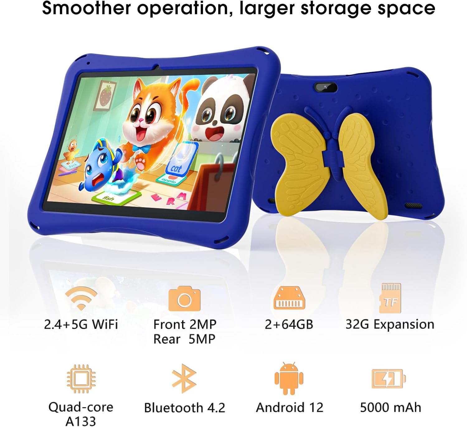 The included kid-proof case is designed to protect the tablet from dust, bumps, and drops. It also features a hollow design for heat dissipation. Ensure the tablet is properly seated within the case for maximum protection.